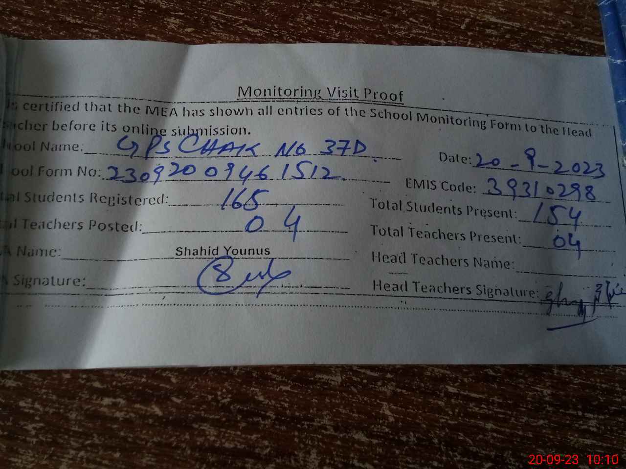 | EMIS Code: 39310298 | Name of School: GPS CHAK NO. 37/D | |||