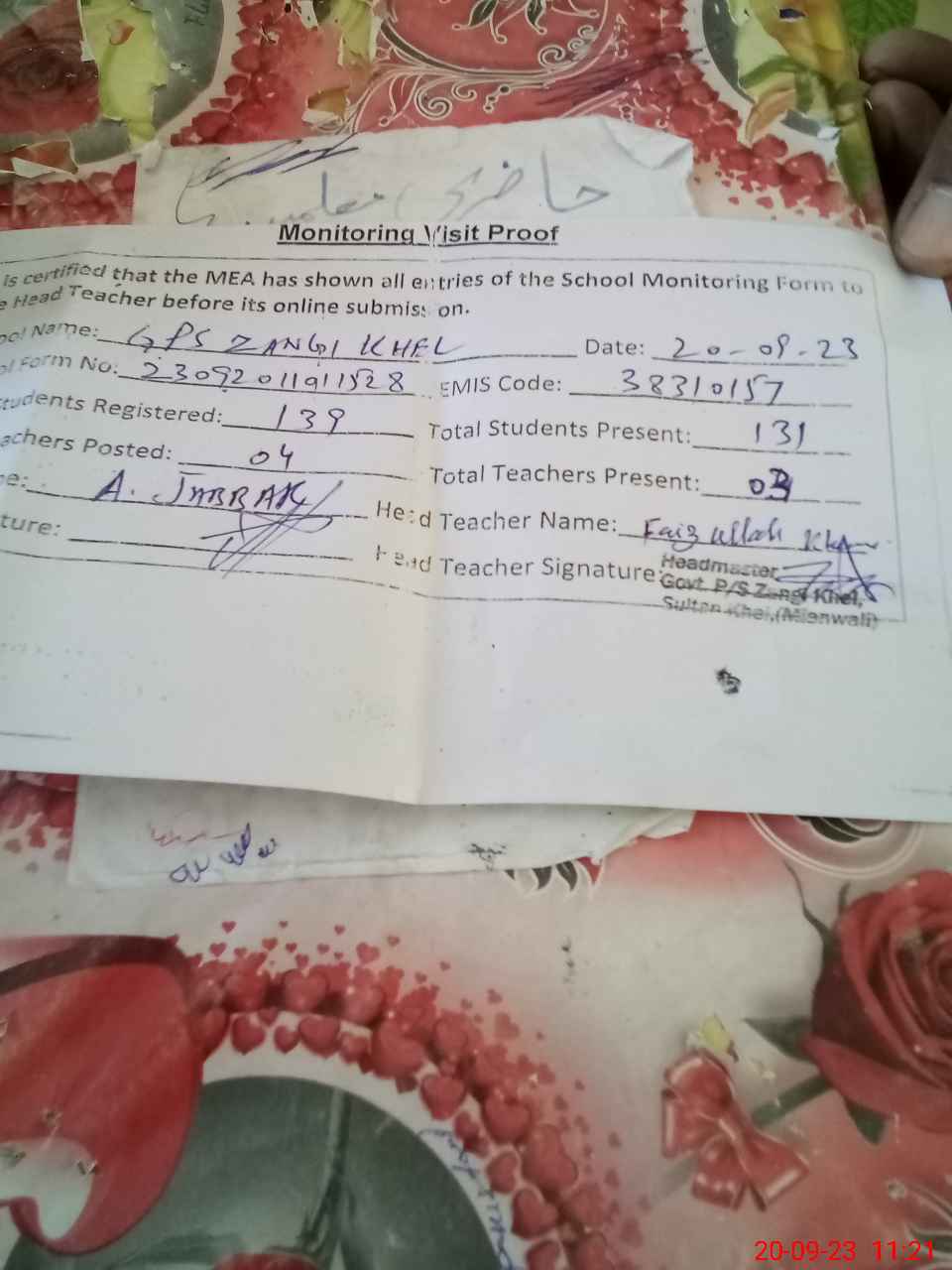 | Attendance Register | Head Teacher | MEA with School | Visit Proof |