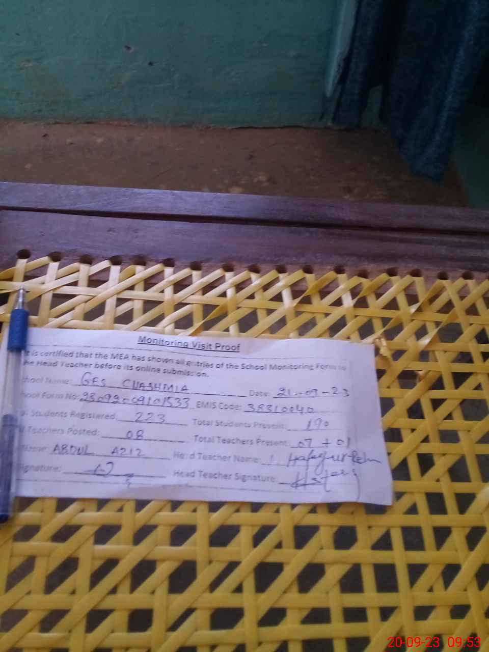 | Attendance Register | Head Teacher | MEA with School | Visit Proof |