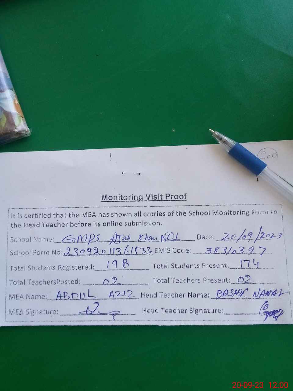 | Attendance Register | Head Teacher | MEA with School | Visit Proof |