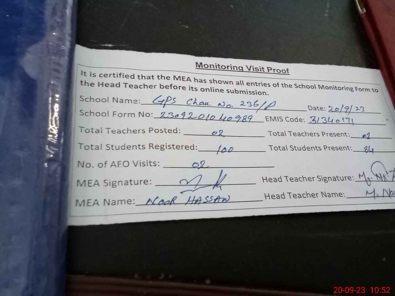 | Attendance Register | Head Teacher | MEA with School | Visit Proof |