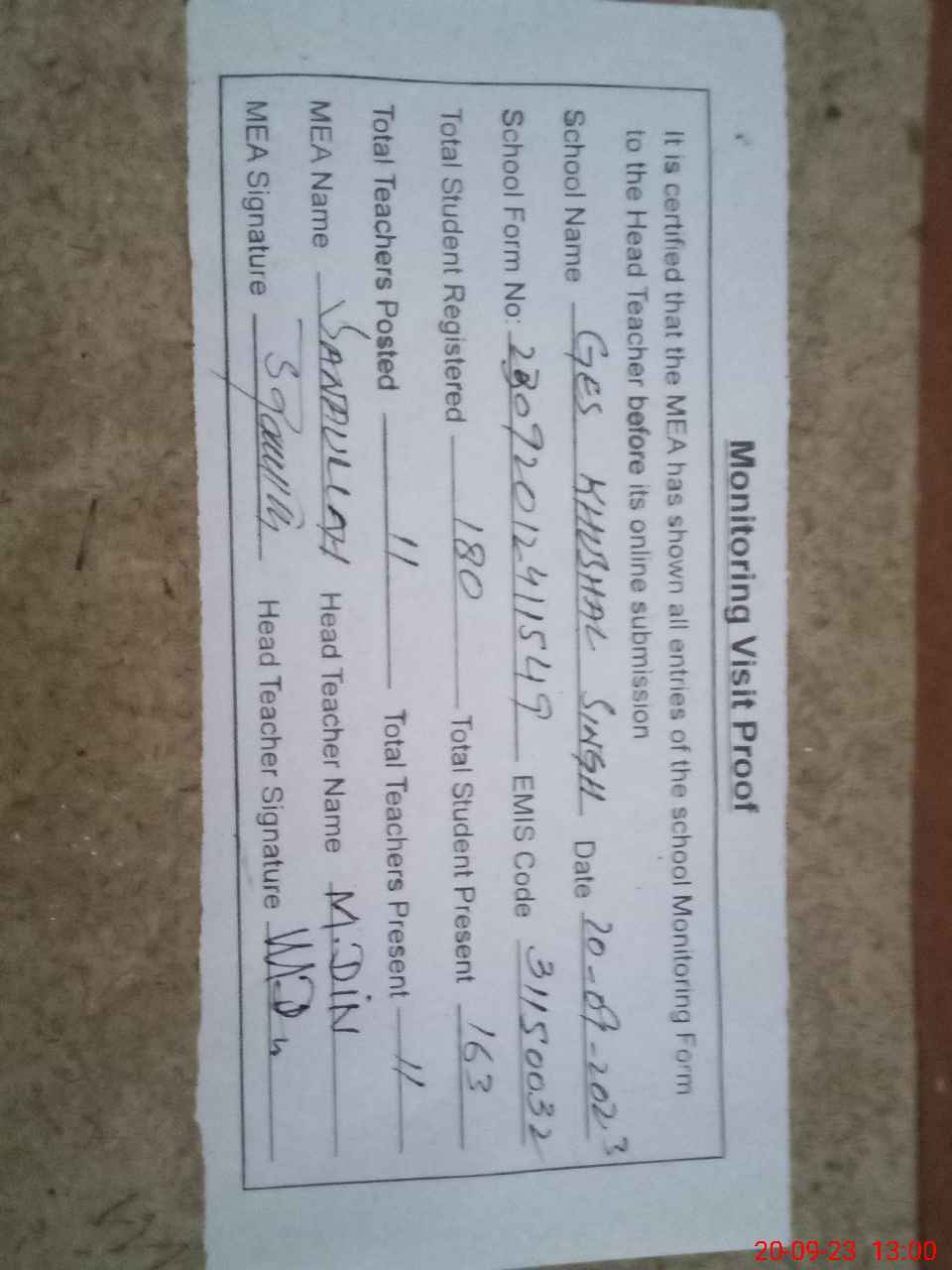 | Attendance Register | Head Teacher | MEA with School | Visit Proof |