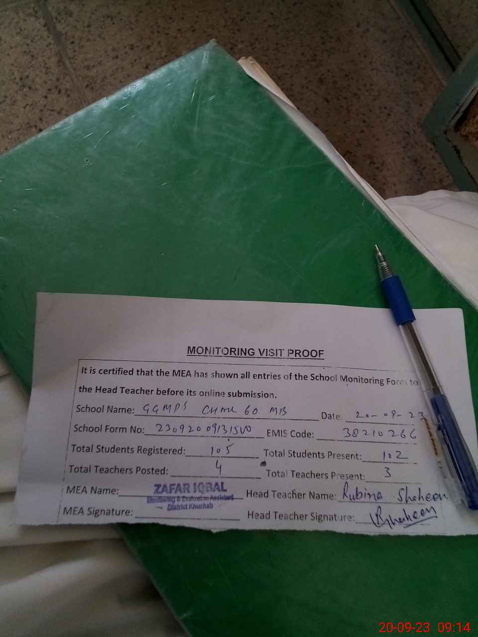 | Attendance Register | Head Teacher | MEA with School | Visit Proof |