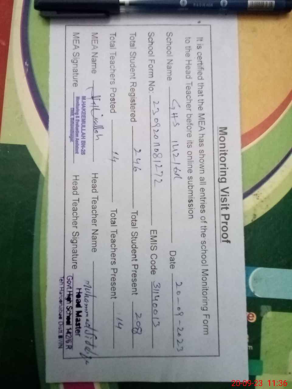 | Attendance Register | Head Teacher | MEA with School | Visit Proof |