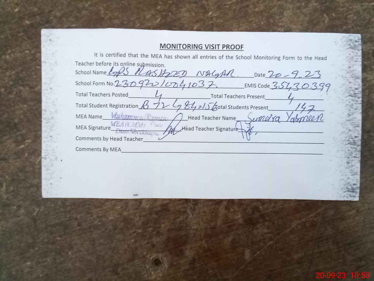 | Attendance Register | Head Teacher | MEA with School | Visit Proof |