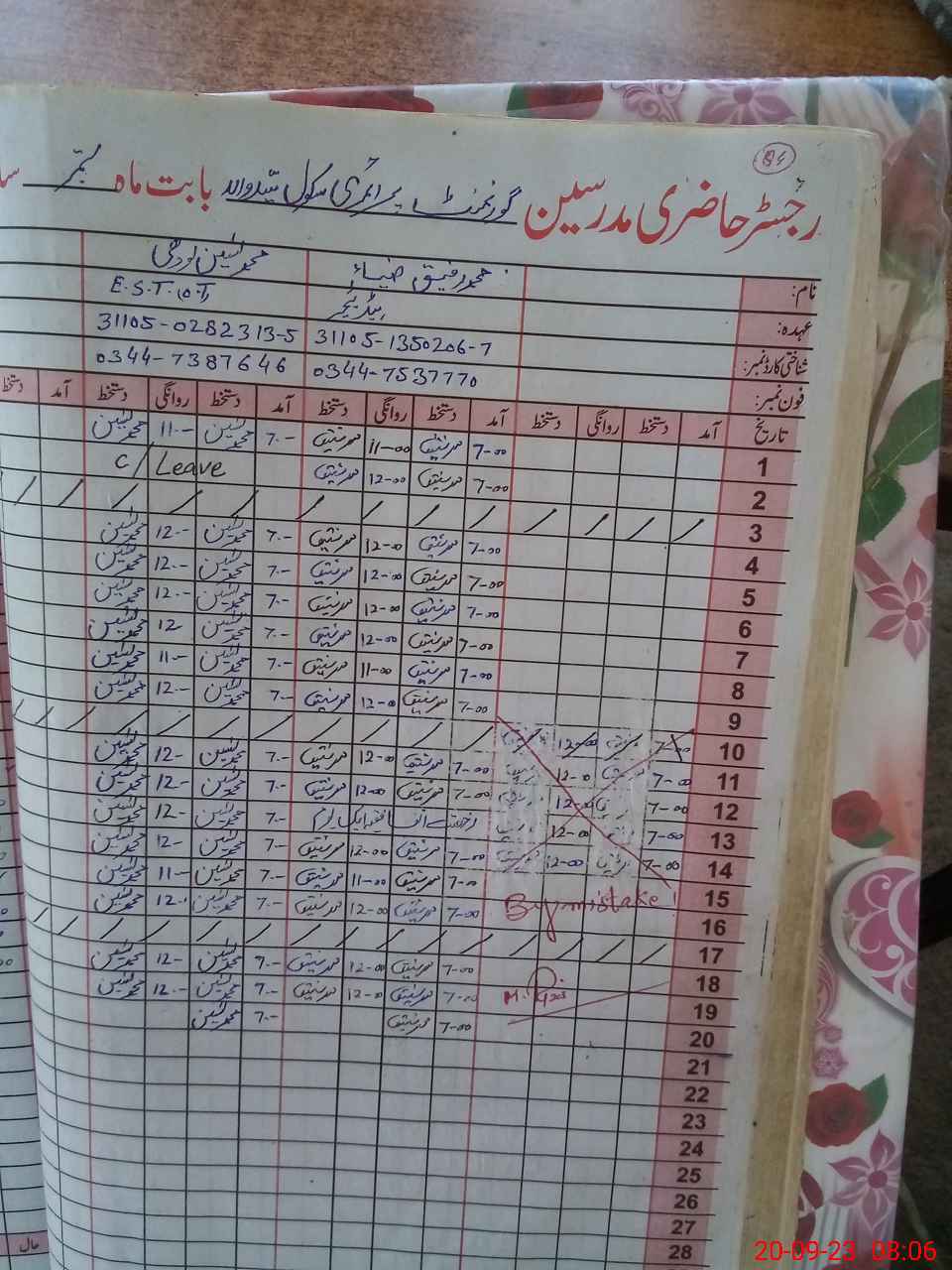 | Name: MU**** Ta**** Designation: (School Headmaster's/Headmistress's) P S T Phone/Cell Number: 03**** |