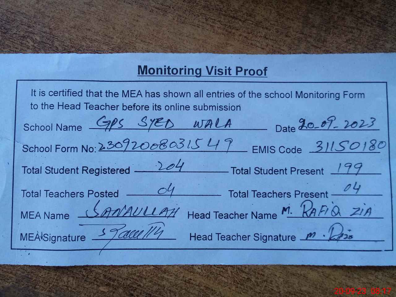 | Attendance Register | Head Teacher | MEA with School | Visit Proof |