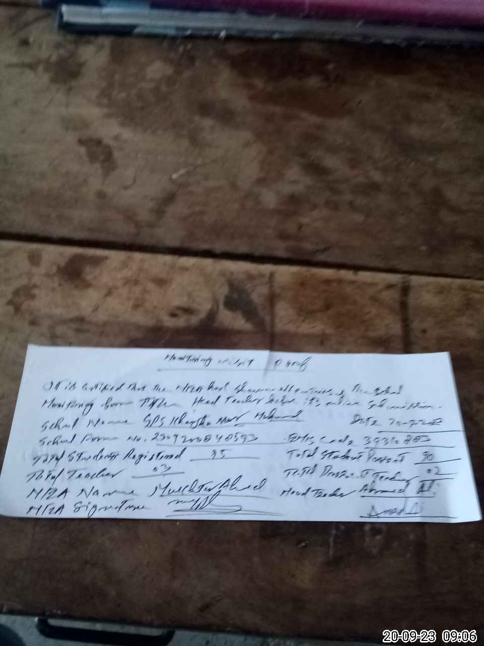 | Attendance Register | Head Teacher | MEA with School | Visit Proof |