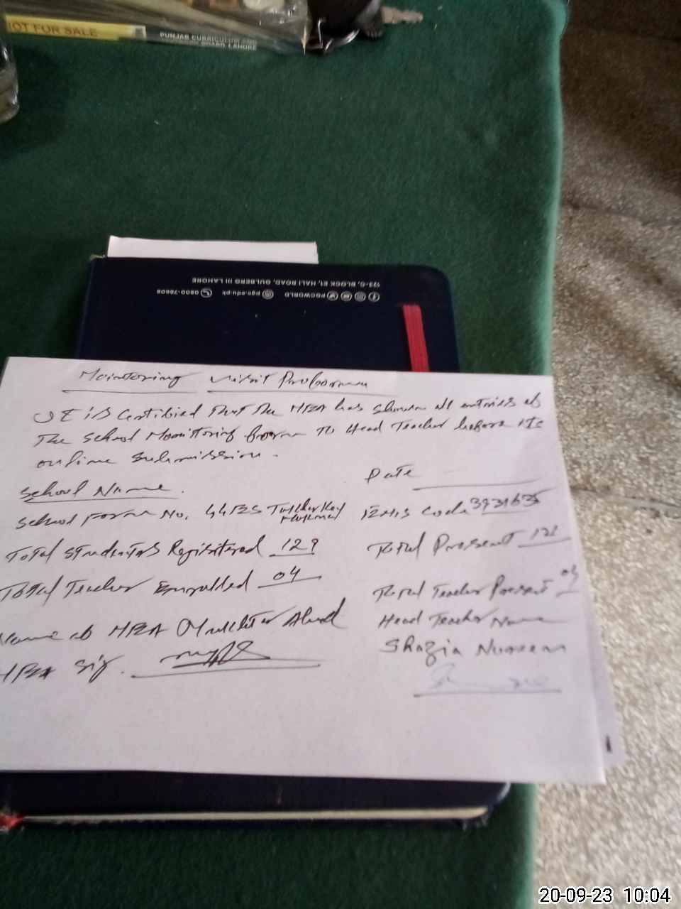 | Attendance Register | Head Teacher | MEA with School | Visit Proof |
