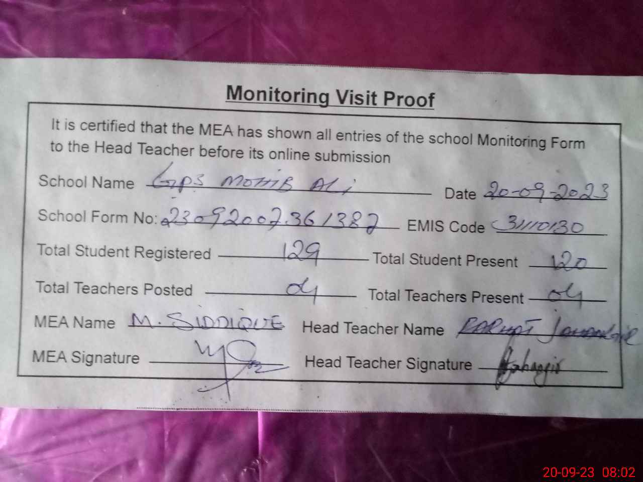 | EMIS Code: 31110130 | Name of School: GPS MOHIB ALI | |||