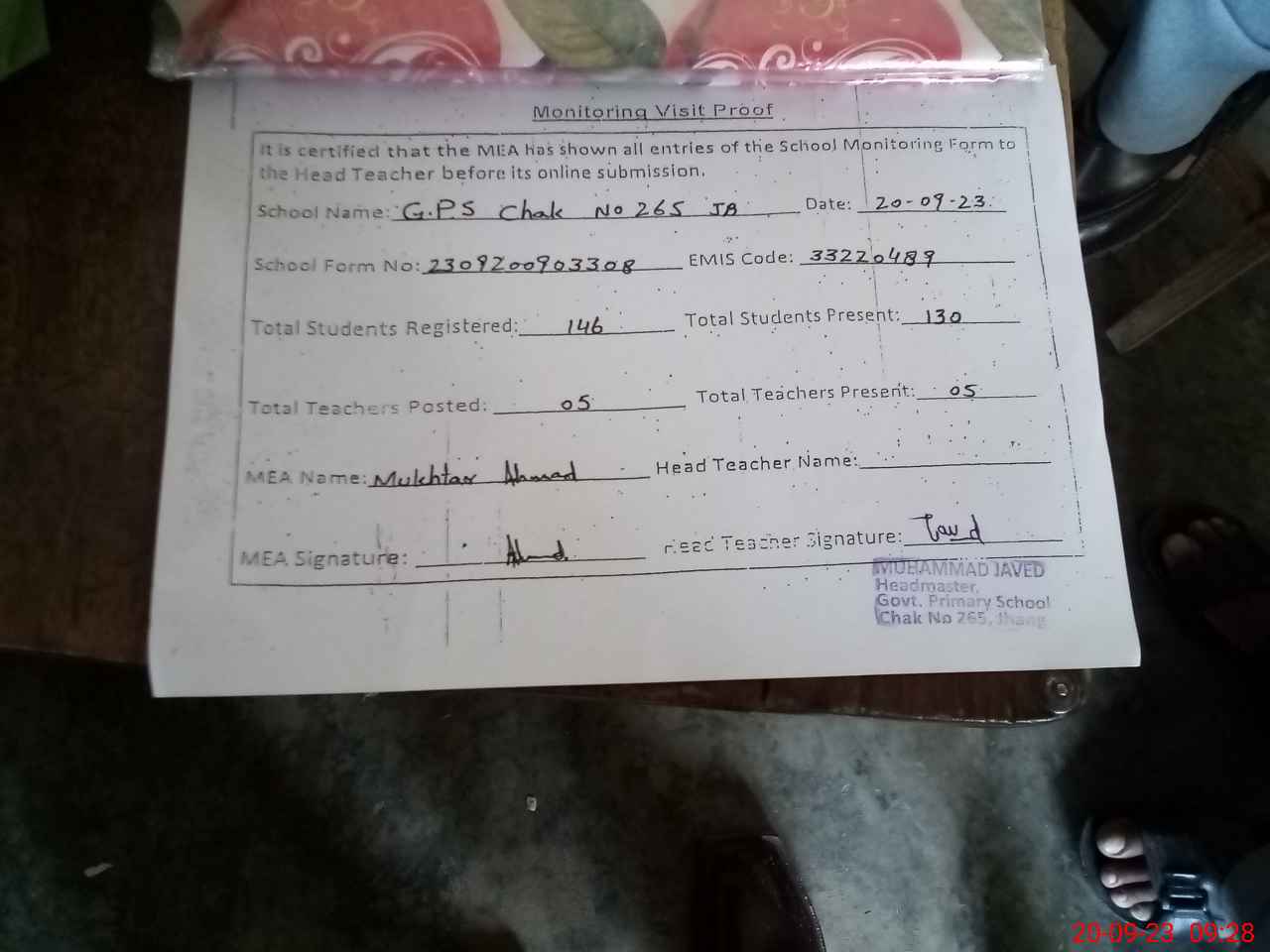 | Attendance Register | Head Teacher | MEA with School | Visit Proof |
