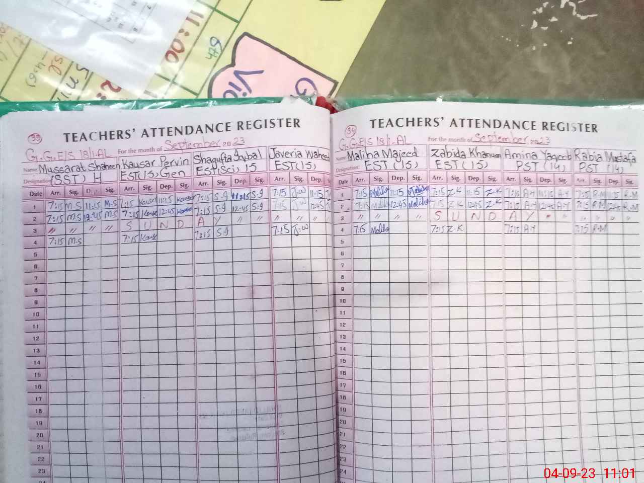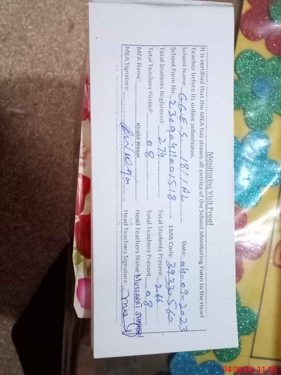 | Attendance Register | Head Teacher | MEA with School | Visit Proof |