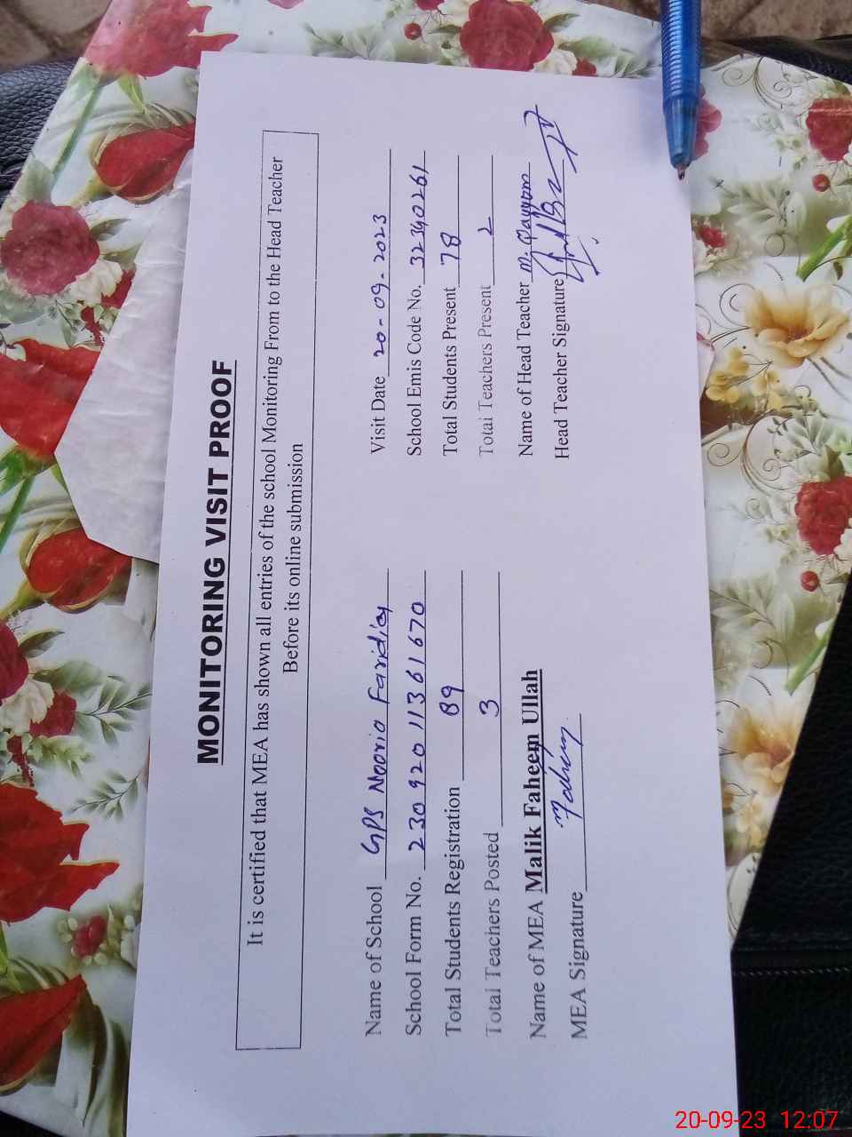 | EMIS Code: 32340261 | Name of School: GPS NOORIA FARIDIA | |||