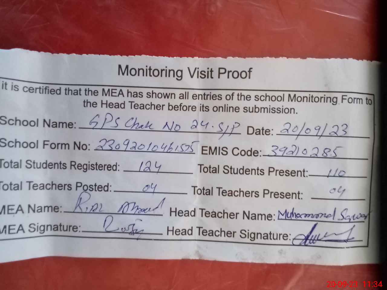| Attendance Register | Head Teacher | MEA with School | Visit Proof |