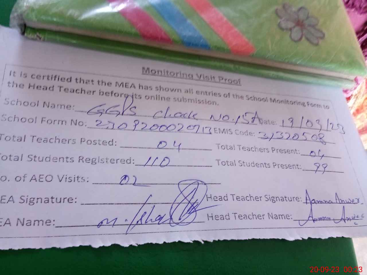 | Attendance Register | Head Teacher | MEA with School | Visit Proof |