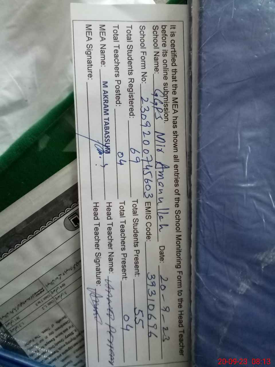 | Attendance Register | Head Teacher | MEA with School | Visit Proof |