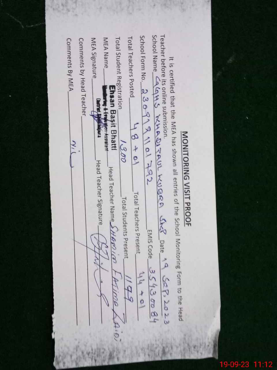 | Certified that this School was Inspected by the Undersigned MEA/DMO Today and the Information Stated Above is as Per Record. | |||||
