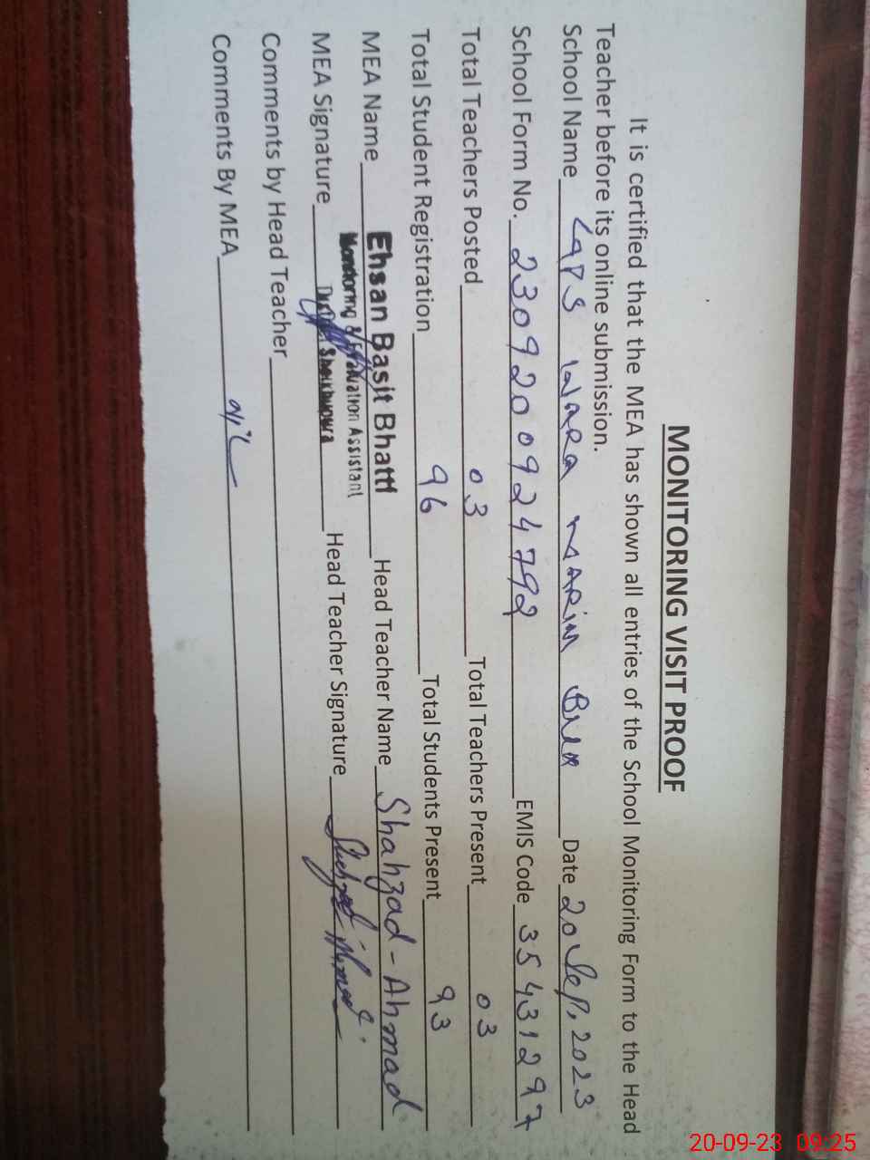 | Attendance Register | Head Teacher | MEA with School | Visit Proof |