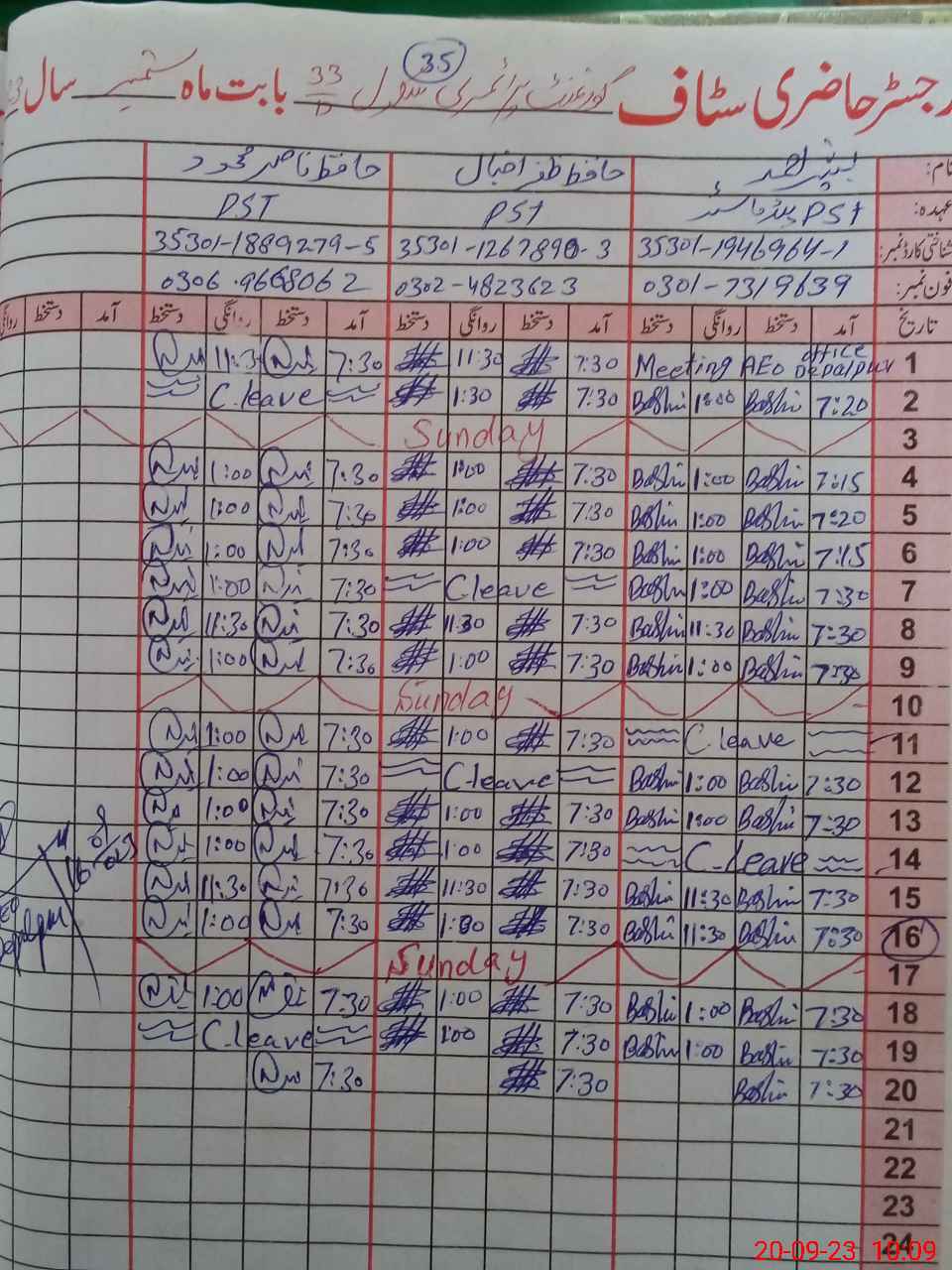 | CNIC | Full Name | Designation | R/C | Absence During Last Calender Month |