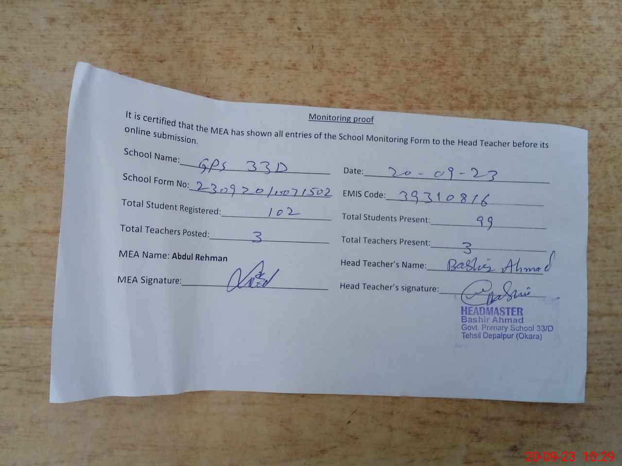 | Attendance Register | Head Teacher | MEA with School | Visit Proof |