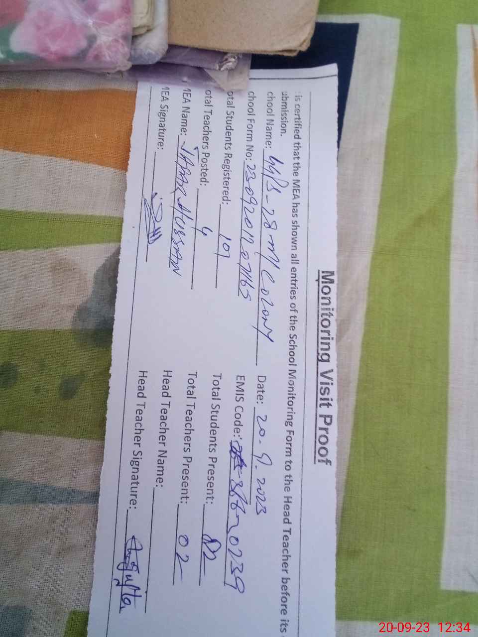 | Attendance Register | Head Teacher | MEA with School | Visit Proof |