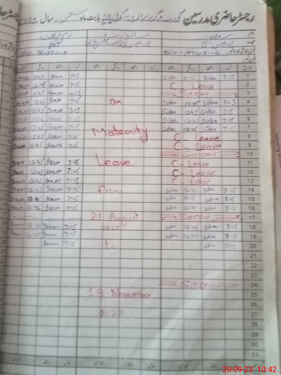 | 36**** | Sa**** Ar**** | 1 | 1 | 0 | 0 | 0 | 0 | 0 | 0 | 0 | 0 | 0 | Maternity |