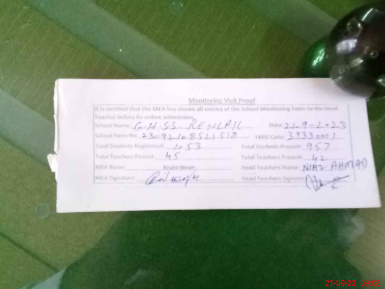 | Attendance Register | Head Teacher | MEA with School | Visit Proof |