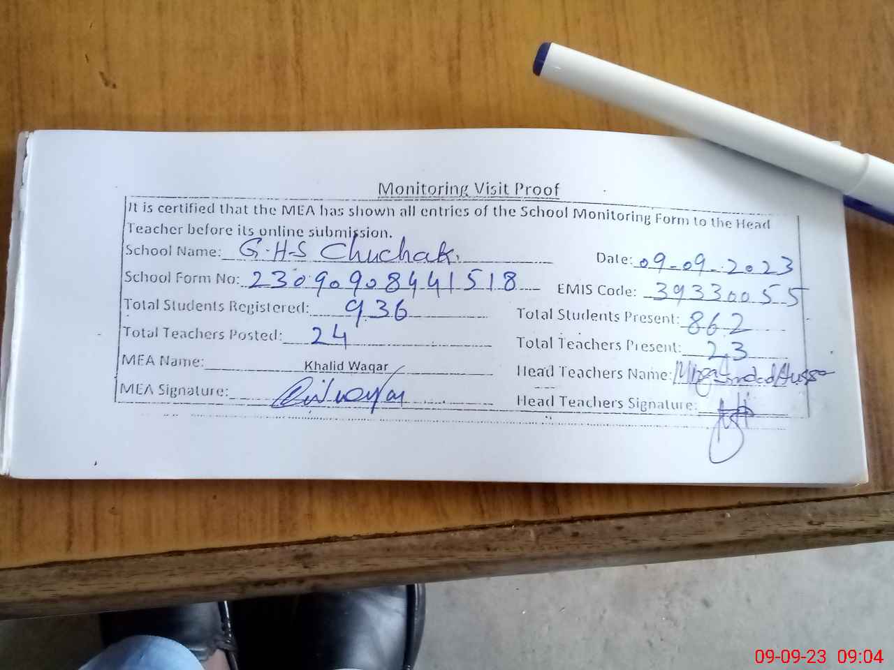 | Attendance Register | Head Teacher | MEA with School | Visit Proof |