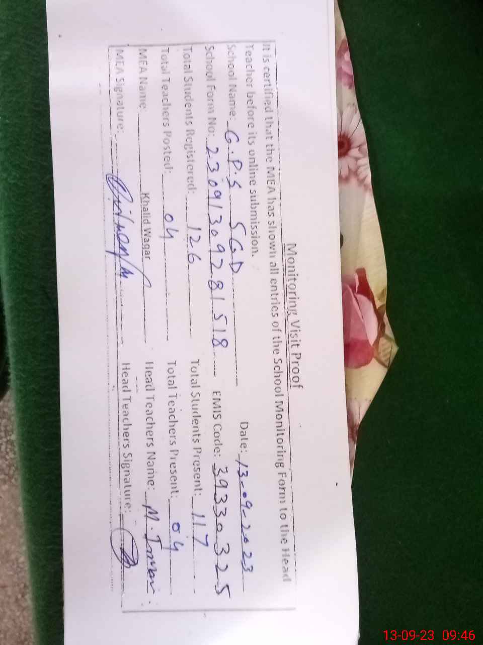 | Attendance Register | Head Teacher | MEA with School | Visit Proof |