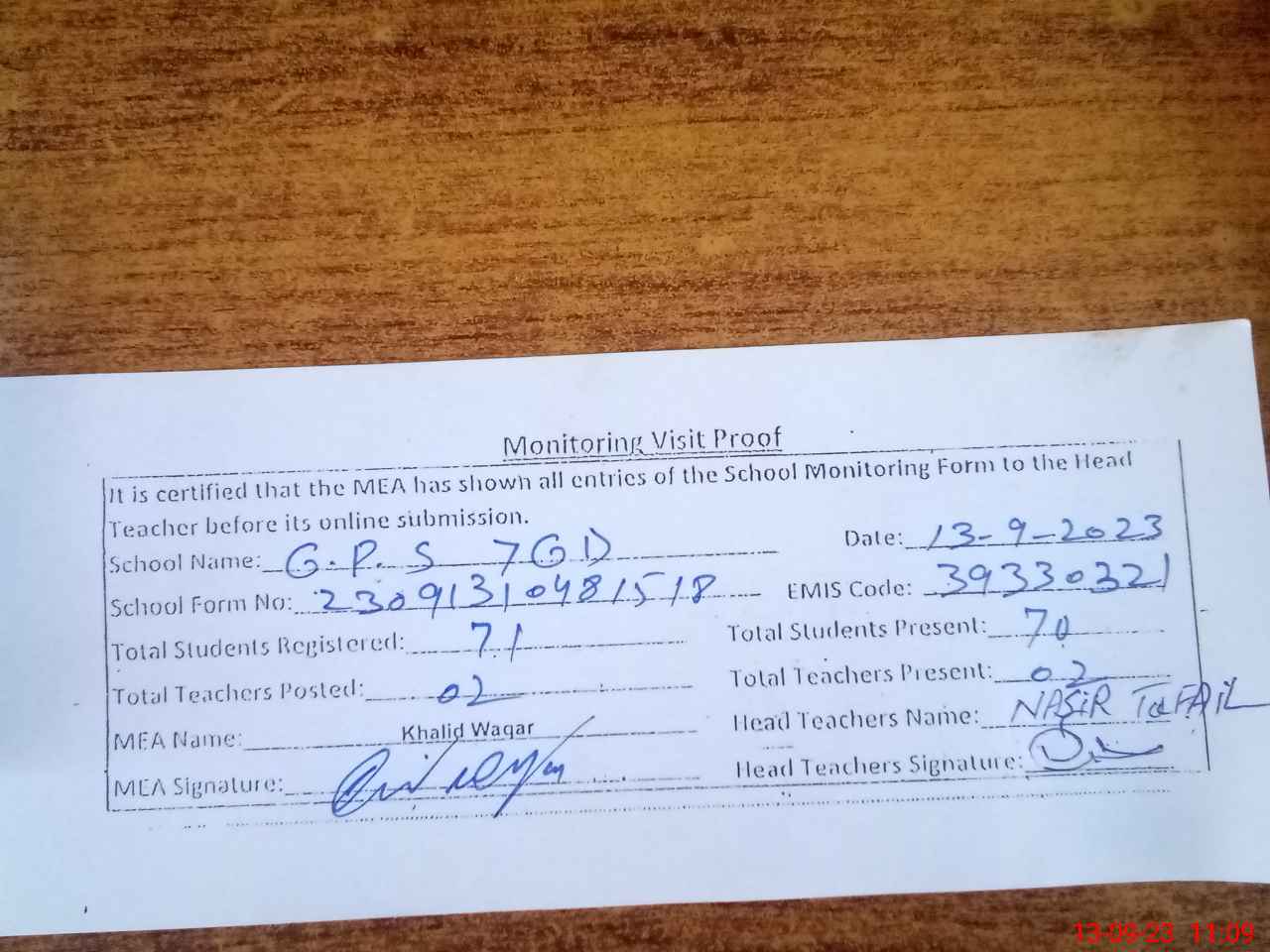 | Attendance Register | Head Teacher | MEA with School | Visit Proof |