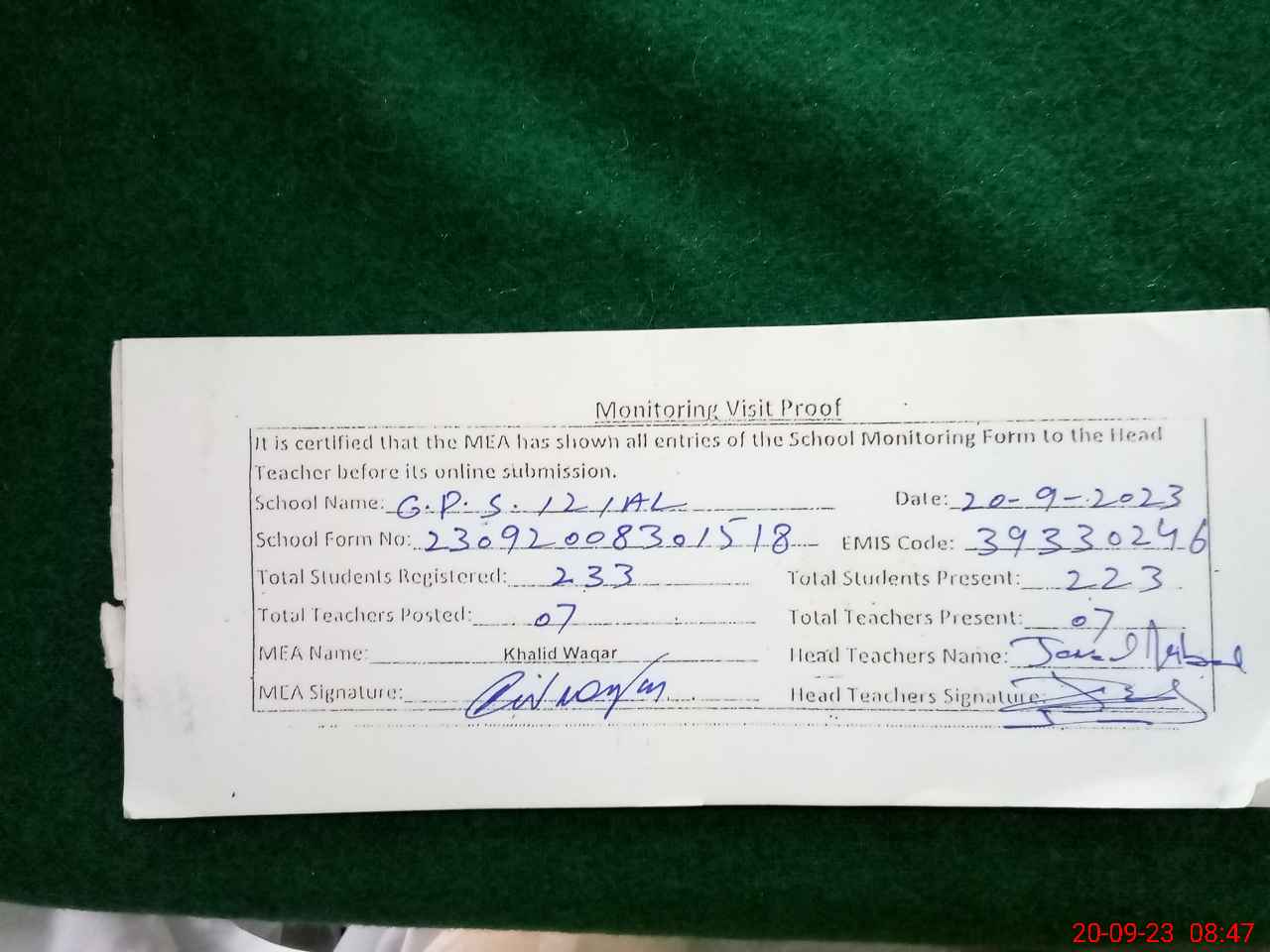 | Attendance Register | Head Teacher | MEA with School | Visit Proof |