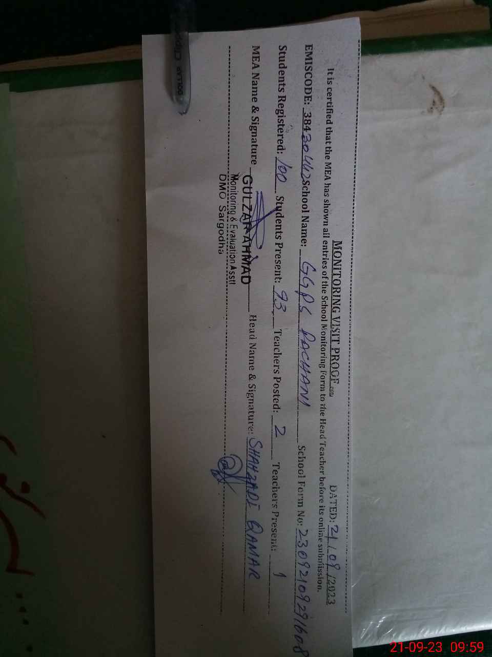 | Attendance Register | Head Teacher | MEA with School | Visit Proof |