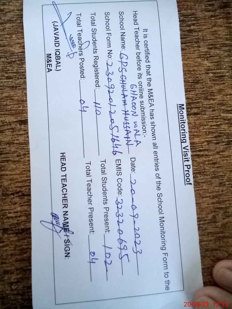 | Attendance Register | Head Teacher | MEA with School | Visit Proof |