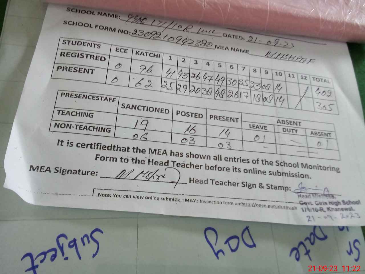 | Attendance Register | Head Teacher | MEA with School | Visit Proof |