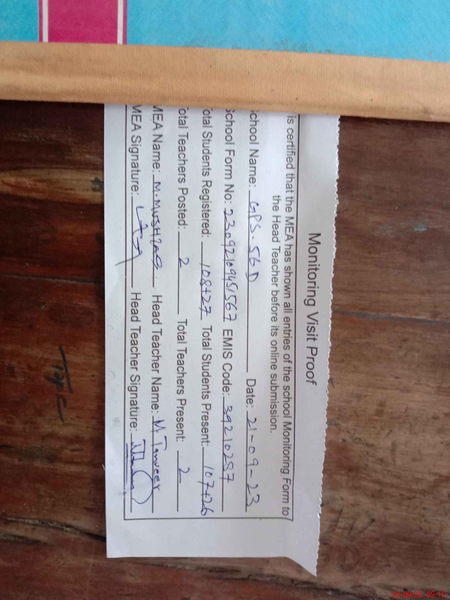 | Attendance Register | Head Teacher | MEA with School | Visit Proof |