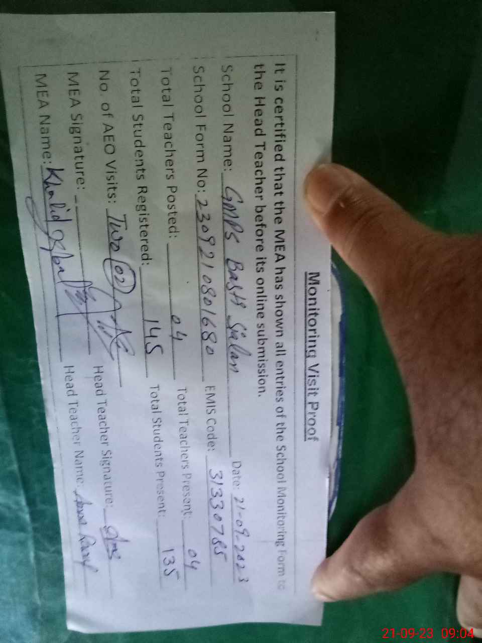 | Attendance Register | Head Teacher | MEA with School | Visit Proof |