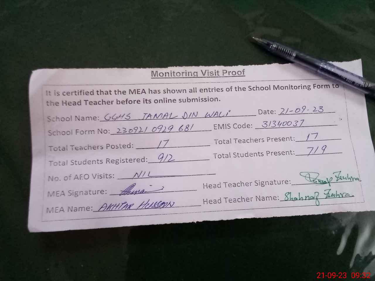 | Attendance Register | Head Teacher | MEA with School | Visit Proof |