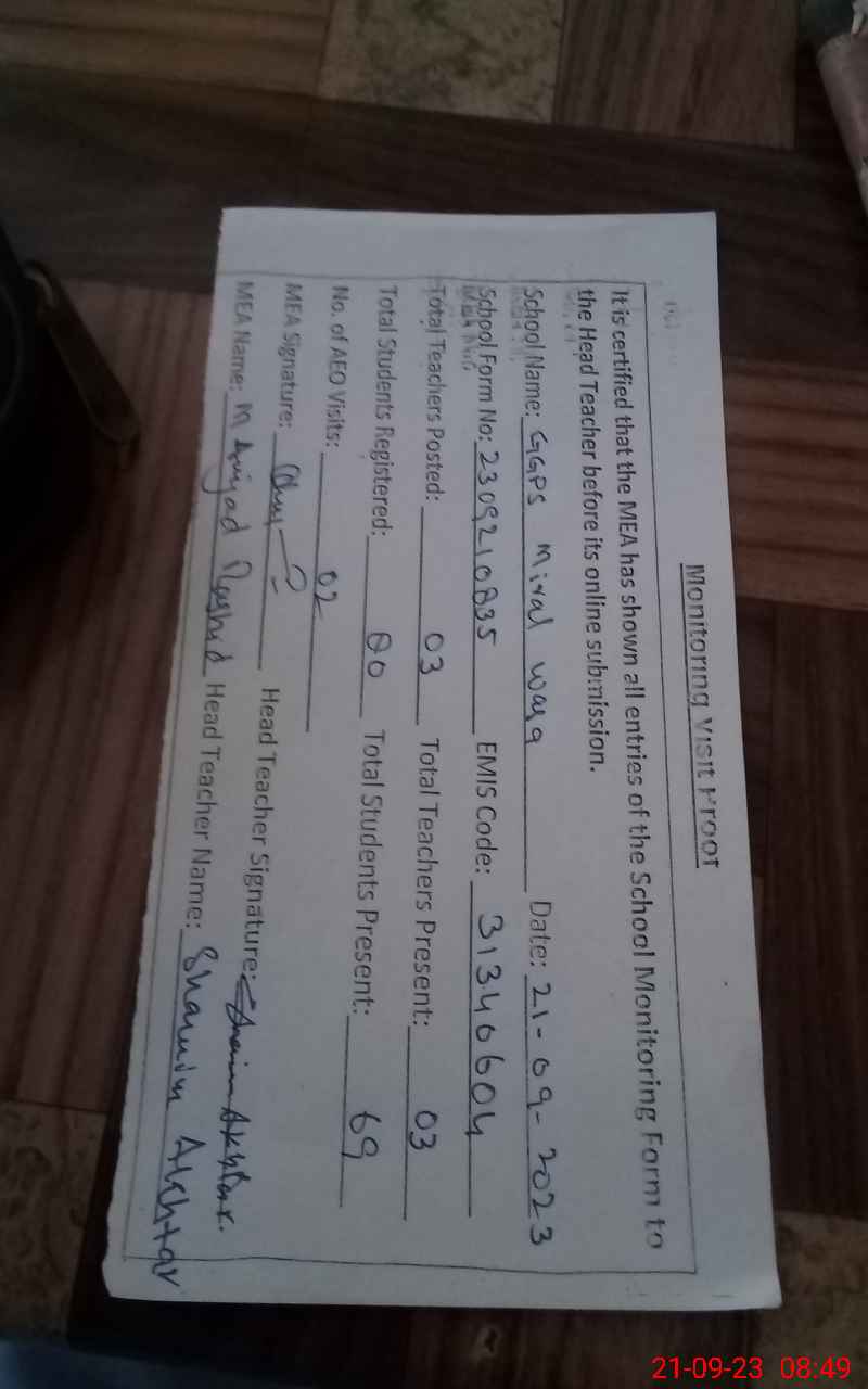 | Attendance Register | Head Teacher | MEA with School | Visit Proof |