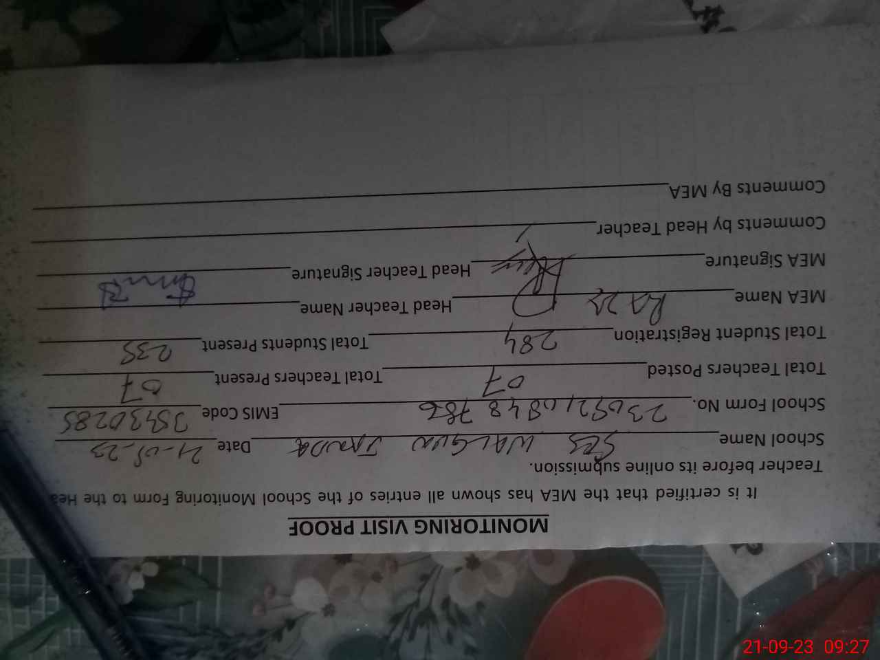 | Attendance Register | Head Teacher | MEA with School | Visit Proof |