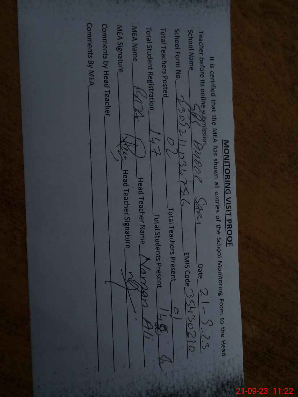 | Attendance Register | Head Teacher | MEA with School | Visit Proof |