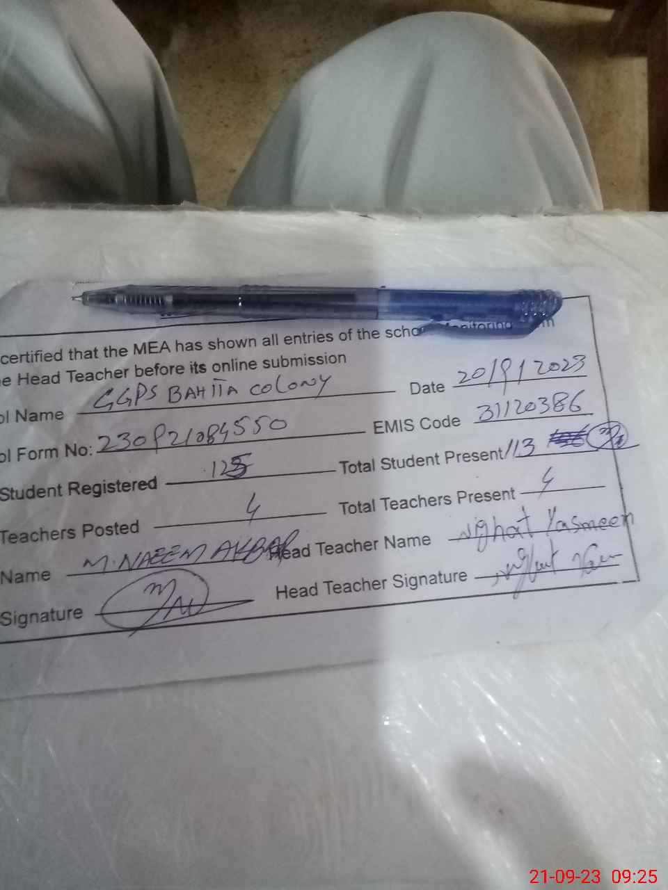 | Attendance Register | Head Teacher | MEA with School | Visit Proof |