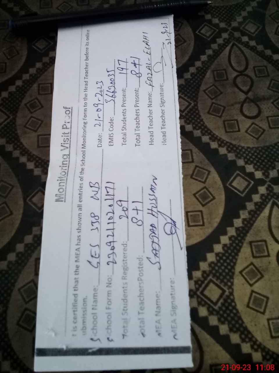 | Name: Mu**** Na**** Designation: (School Headmaster's/Headmistress's) EST Phone/Cell Number: 03**** |