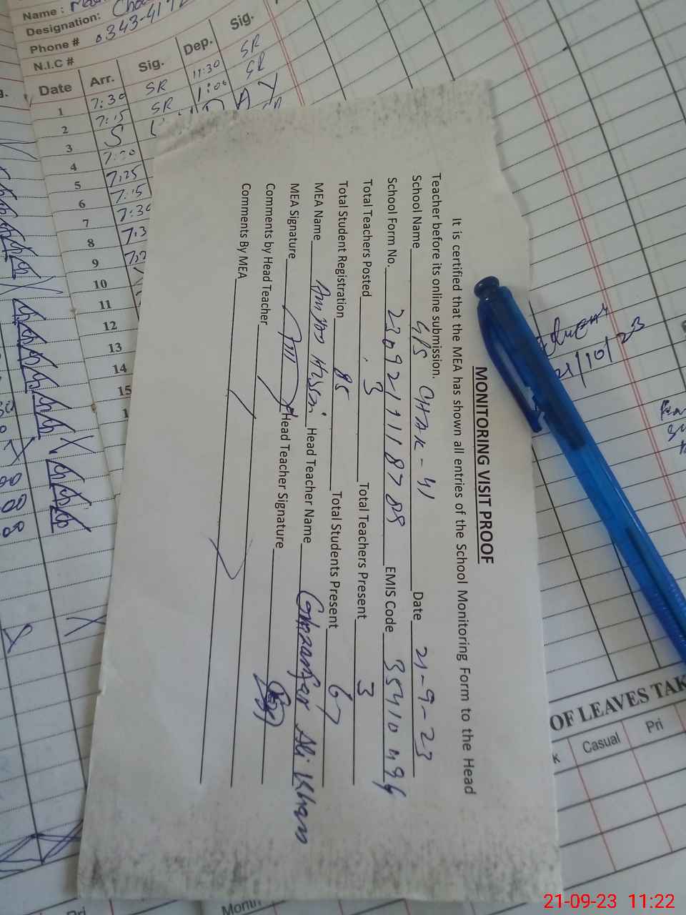 | Attendance Register | Head Teacher | MEA with School | Visit Proof |