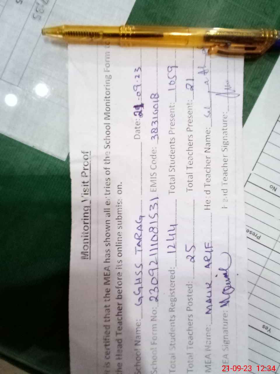 | Attendance Register | Head Teacher | MEA with School | Visit Proof |