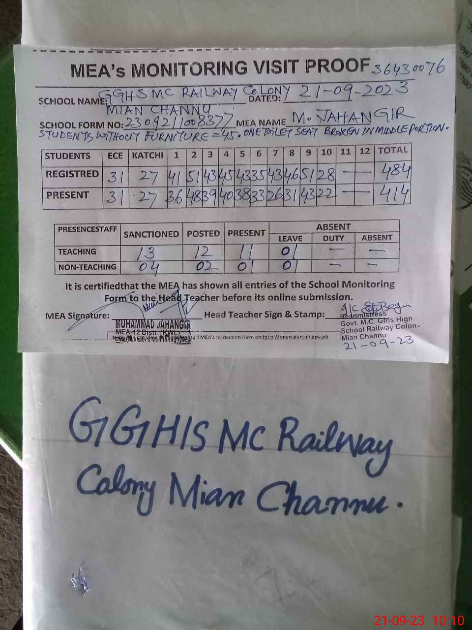 | EMIS Code: 36430076 | Name of School: GGHS MC RAILWAY COLONY, MIAN CHANNU | |||
