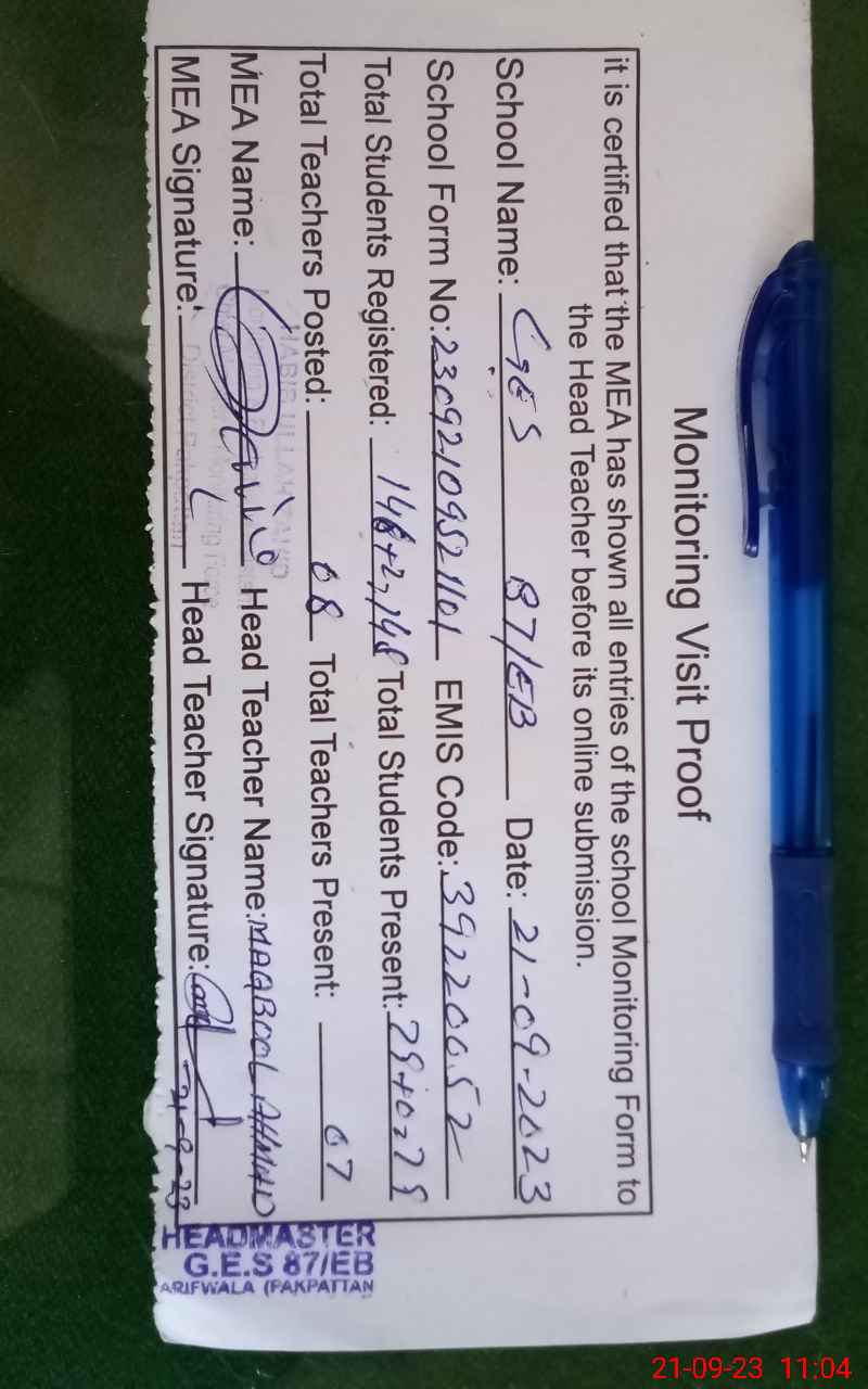 | EMIS Code: 39220052 | Name of School: GES 87 EB ARIFWALA | |||