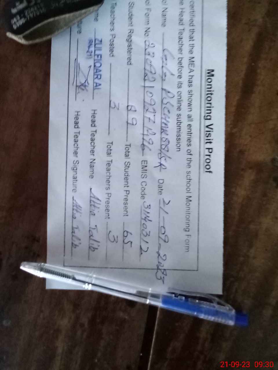 | Attendance Register | Head Teacher | MEA with School | Visit Proof |