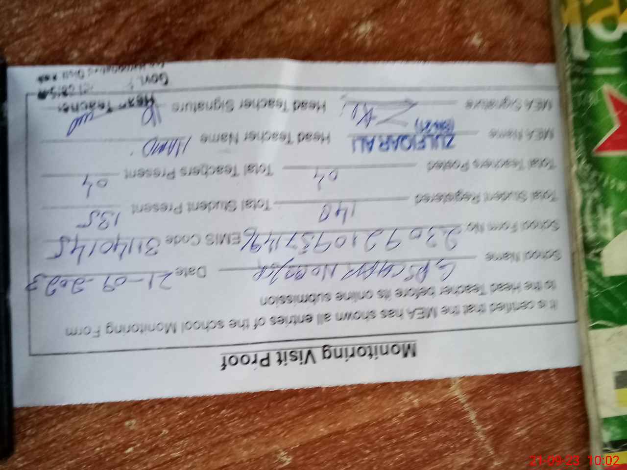 | Attendance Register | Head Teacher | MEA with School | Visit Proof |
