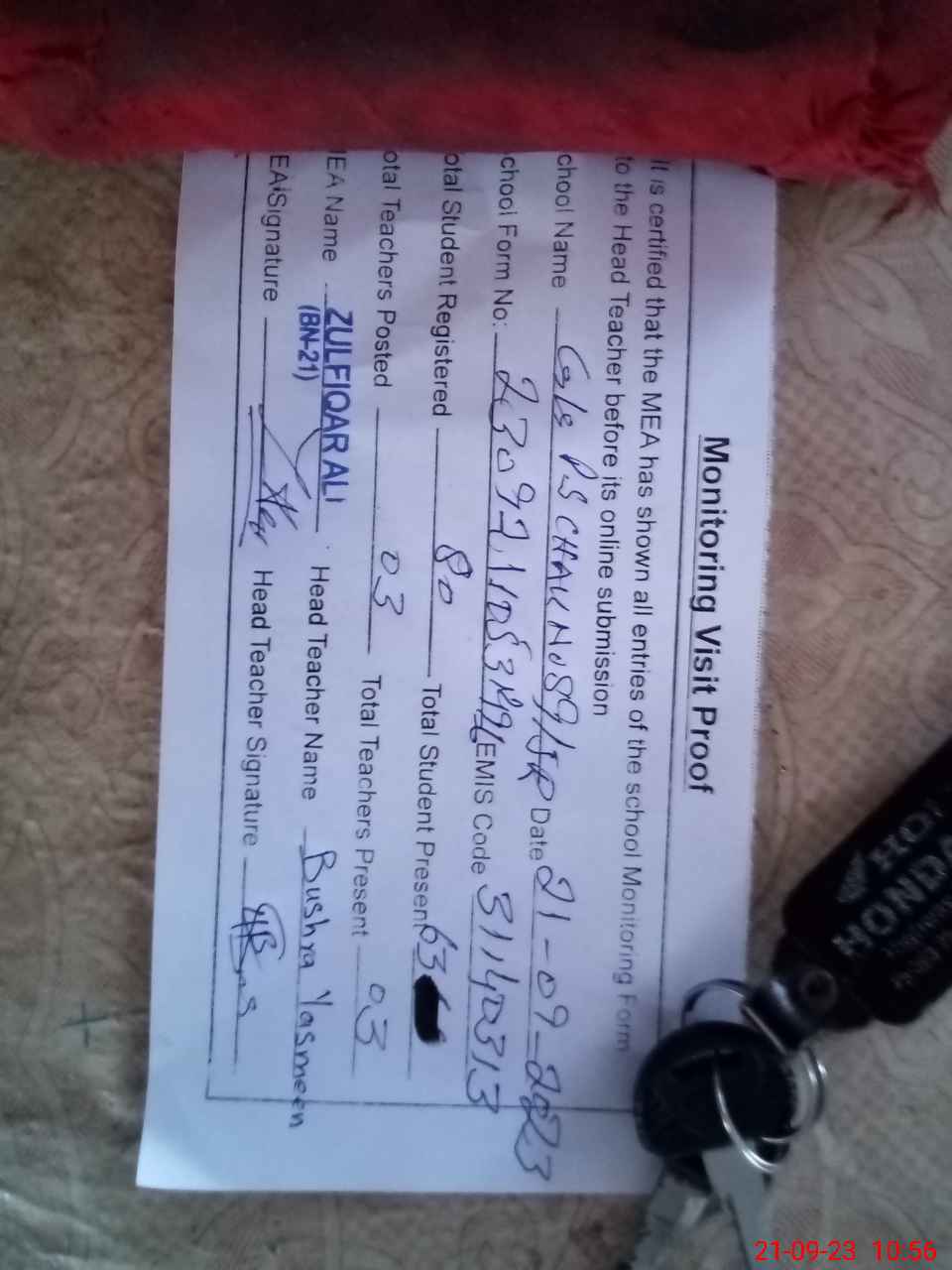 | Attendance Register | Head Teacher | MEA with School | Visit Proof |
