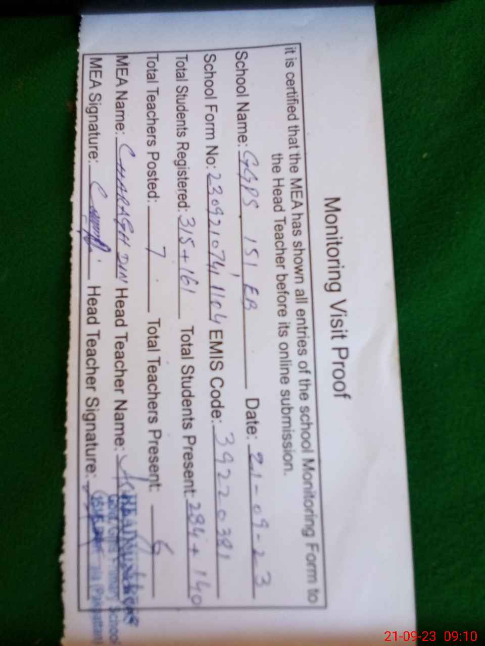 | Attendance Register | Head Teacher | MEA with School | Visit Proof |